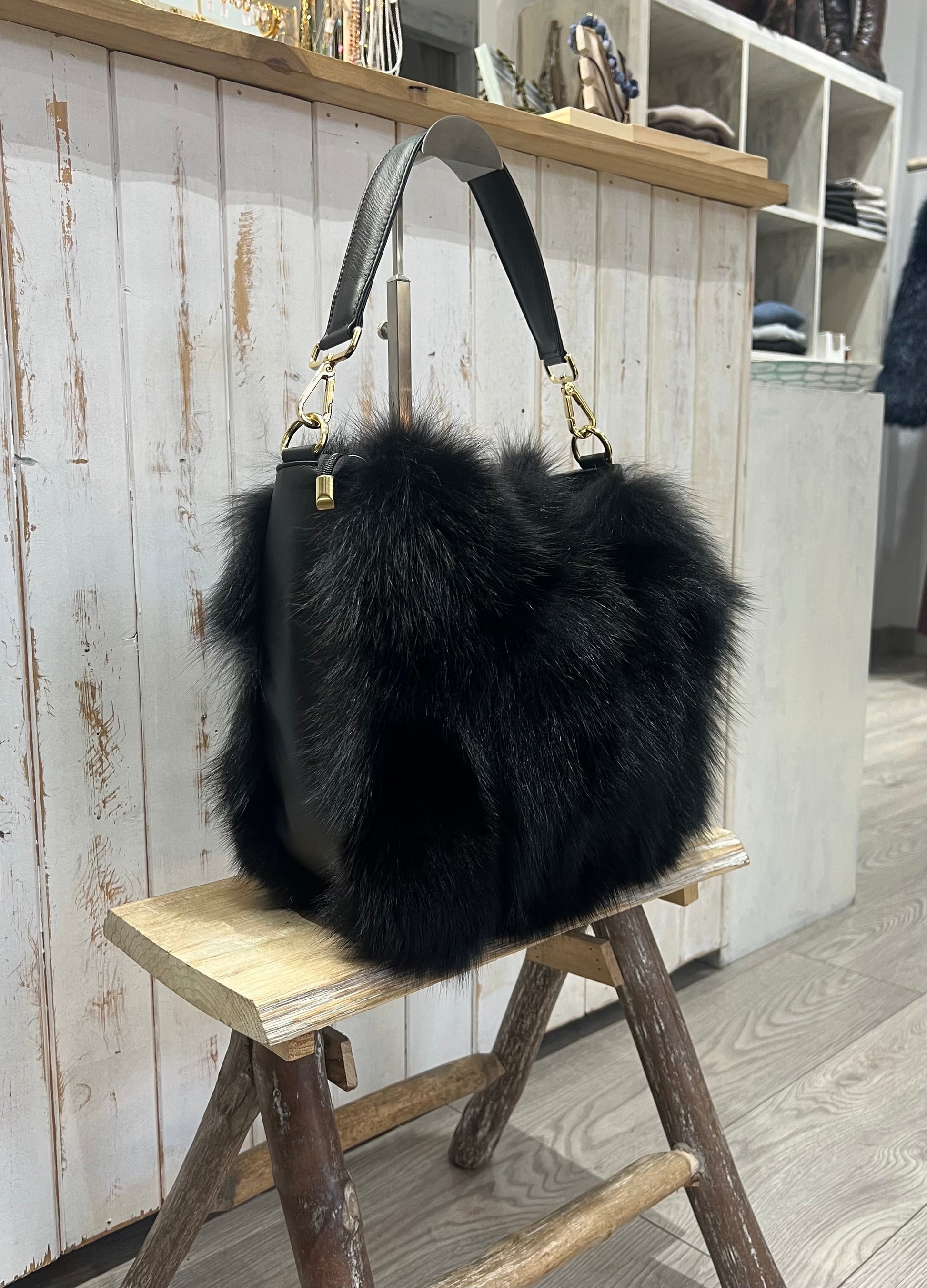 Bolso confeccionado en piel de alta calidad con un acabado de pelo natural, suave al tacto y de aspecto elegante. Incluye correa desmontable de cuero genuino y herrajes dorados que aportan un toque sofisticado.
